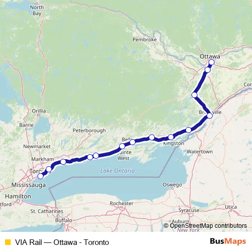 The first stop of the VIA Rail rail route is Toronto and the last stop is Ottawa. VIA Rail (Ottawa - Toronto) is operational during everyday.