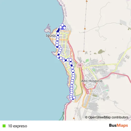 See why over 2 million users trust and consider busmaps.com as the best public transport website. busmaps gives you Iquique Buses suggested routes, real-time bus tracker, line route maps in Iquique, and helps to find the closest 10 expreso bus stops near you. No internet available? Download an offline PDF map and bus schedule for the 10 expreso bus to take on your trip.