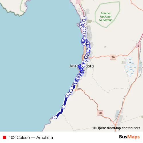 See why over 2 million users trust and consider busmaps.com as the best public transport website. busmaps gives you Antofagasta Buses suggested routes, real-time bus tracker, line route maps in Antofagasta, and helps to find the closest 102 Coloso bus stops near you. No internet available? Download an offline PDF map and bus schedule for the 102 Coloso bus to take on your trip.