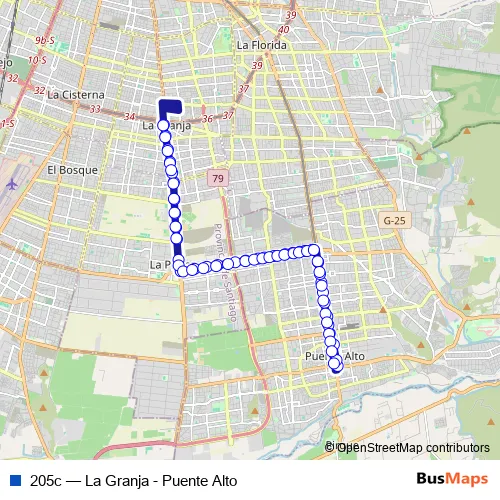 The first stop of the 205c bus route is Pf93-Balmaceda / esq. Av. Eyzaguirre and the last stop is Pf89-Av. Concha y Toro / esq. Av. Eyzaguirre. 205c (La Granja - Puente Alto) is operational during on weekdays.