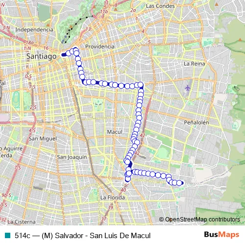 The first stop of the 514c bus route is Pc199-Parada 3 / Museo de Los Tajamares and the last stop is Pe274-Av. Departamental / esq. Los Cerezos. 514c ((M) Salvador - San Luis De Macul) is operational during on weekdays.