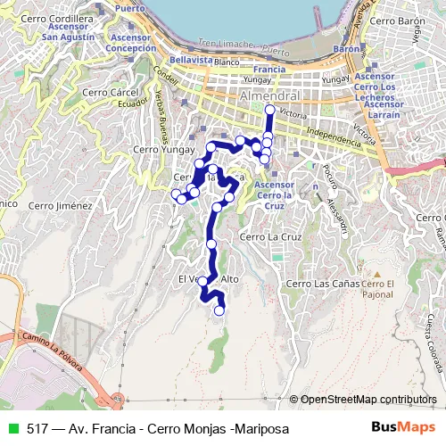 The first stop of the 517 bus route is Paradero Servicio 517 and the last stop is Paradero N°8. 517 (Av. Francia - Cerro Monjas -Mariposa) is operational during everyday.
