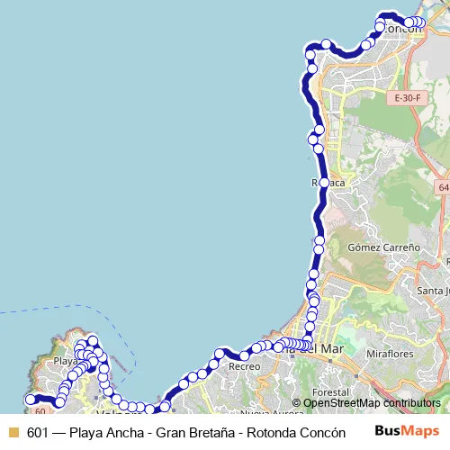 Bus 601 - Playa Ancha - Gran Bretaña - Rotonda Concón: Full Schedule in Valparaiso