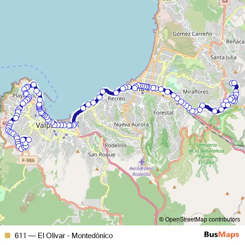 The first stop of the 611 bus route is Agusto D'Halmar 252 and the last stop is Carlos Pezoa Veliz / Joaquin Venegas. 611 (El Olivar - Montedónico) is operational during everyday.