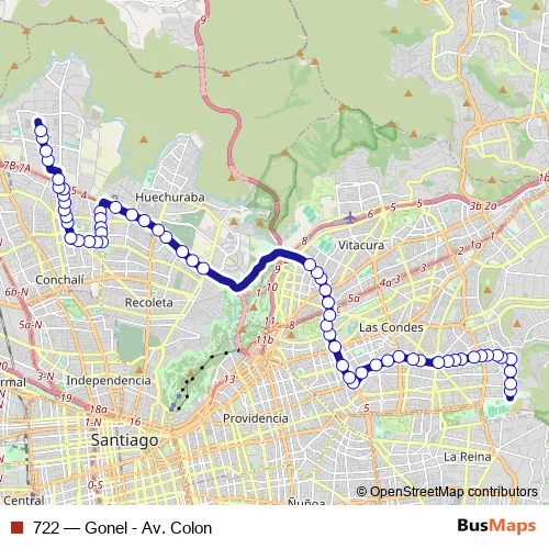 The first stop of the 722 bus route is Pc1223-Vital Apoquindo / esq. Lucaro and the last stop is Pb2064-Santa Marta de H. / esq. Alberto Undurraga. 722 (Gonel - Av. Colon) is operational during everyday.