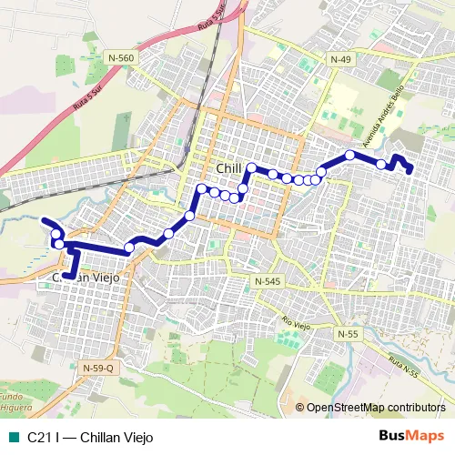 See why over 2 million users trust and consider busmaps.com as the best public transport website. busmaps gives you Chillan Buses suggested routes, real-time bus tracker, line route maps in Chillan, and helps to find the closest C21 I bus stops near you. No internet available? Download an offline PDF map and bus schedule for the C21 I bus to take on your trip.
