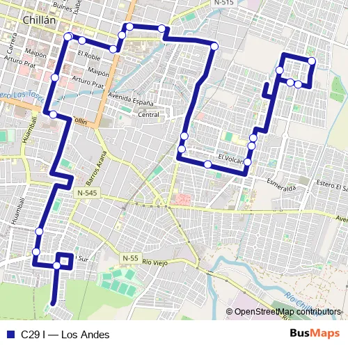 See why over 2 million users trust and consider busmaps.com as the best public transport website. busmaps gives you Chillan Buses suggested routes, real-time bus tracker, line route maps in Chillan, and helps to find the closest C29 I bus stops near you. No internet available? Download an offline PDF map and bus schedule for the C29 I bus to take on your trip.