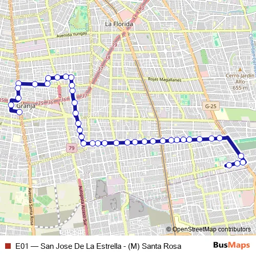 See why over 2 million users trust and consider busmaps.com as the best public transport website. busmaps gives you Santiago Buses suggested routes, real-time bus tracker, line route maps in Santiago, and helps to find the closest E01 bus stops near you. No internet available? Download an offline PDF map and bus schedule for the E01 bus to take on your trip.