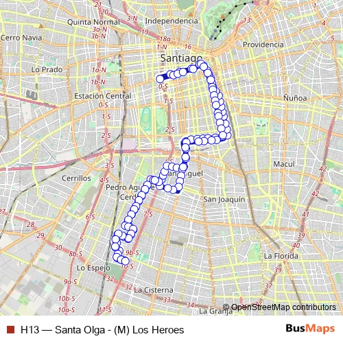 See why over 2 million users trust and consider busmaps.com as the best public transport website. busmaps gives you Santiago Buses suggested routes, real-time bus tracker, line route maps in Santiago, and helps to find the closest H13 bus stops near you. No internet available? Download an offline PDF map and bus schedule for the H13 bus to take on your trip.