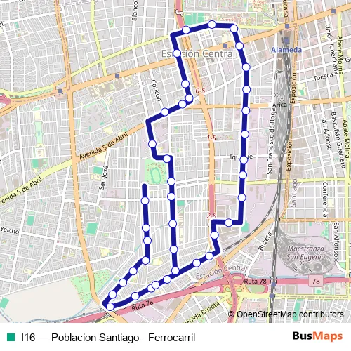 The first stop of the I16 bus route is Pi1589-Avenida del Ferrocarril / esq. Diagonal Santiago and the last stop is Pi1221-Uspallata / esq. Capitán Gálvez. I16 (Poblacion Santiago - Ferrocarril) is operational during everyday.