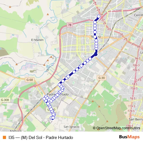 The first stop of the I35 bus route is Pi1930-Escult. Nicanos Plaza / esq. J. Miguel Blanco and the last stop is Pi1788-Parada / Est. Intermodal Del Sol. I35 ((M) Del Sol - Padre Hurtado) is operational during everyday.
