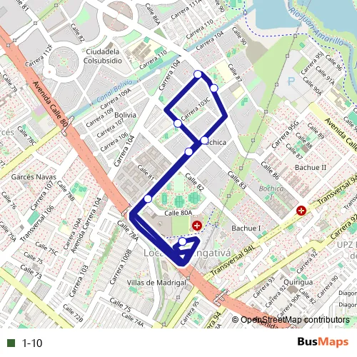 The first stop of the 1-10 bus route is 1-10 Bolivia Bochica Ii and the last stop is 1-10 Bolivia Bochica Ii. 1-10 is operational during everyday.