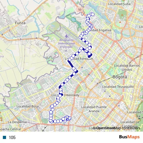 See why over 2 million users trust and consider busmaps.com as the best public transport website. busmaps gives you Bogota Buses suggested routes, real-time bus tracker, line route maps in Bogota, and helps to find the closest 105 bus stops near you. No internet available? Download an offline PDF map and bus schedule for the 105 bus to take on your trip.