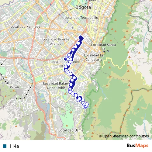 See why over 2 million users trust and consider busmaps.com as the best public transport website. busmaps gives you Bogota Buses suggested routes, real-time bus tracker, line route maps in Bogota, and helps to find the closest 114a bus stops near you. No internet available? Download an offline PDF map and bus schedule for the 114a bus to take on your trip.