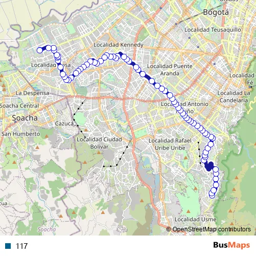 See why over 2 million users trust and consider busmaps.com as the best public transport website. busmaps gives you Bogota Buses suggested routes, real-time bus tracker, line route maps in Bogota, and helps to find the closest 117 bus stops near you. No internet available? Download an offline PDF map and bus schedule for the 117 bus to take on your trip.