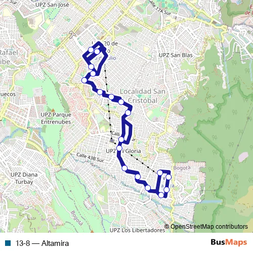 See why over 2 million users trust and consider busmaps.com as the best public transport website. busmaps gives you Bogota Buses suggested routes, real-time bus tracker, line route maps in Bogota, and helps to find the closest 13-8 bus stops near you. No internet available? Download an offline PDF map and bus schedule for the 13-8 bus to take on your trip.