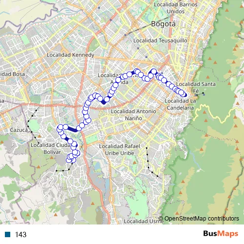 The first stop of the 143 bus route is KR 18Z - CL 66A Sur and the last stop is AC 19 - KR 4. 143 is operational during everyday.
