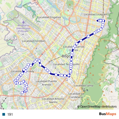 See why over 2 million users trust and consider busmaps.com as the best public transport website. busmaps gives you Bogota Buses suggested routes, real-time bus tracker, line route maps in Bogota, and helps to find the closest 191 bus stops near you. No internet available? Download an offline PDF map and bus schedule for the 191 bus to take on your trip.
