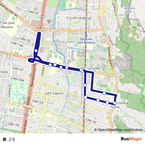 The first stop of the 2-5 bus route is Autopista Norte - Calle 170 and the last stop is Autopista Norte - Calle 170. 2-5 is operational during everyday.