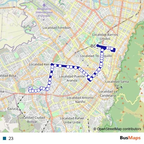 See why over 2 million users trust and consider busmaps.com as the best public transport website. busmaps gives you Bogota Buses suggested routes, real-time bus tracker, line route maps in Bogota, and helps to find the closest 23 bus stops near you. No internet available? Download an offline PDF map and bus schedule for the 23 bus to take on your trip.