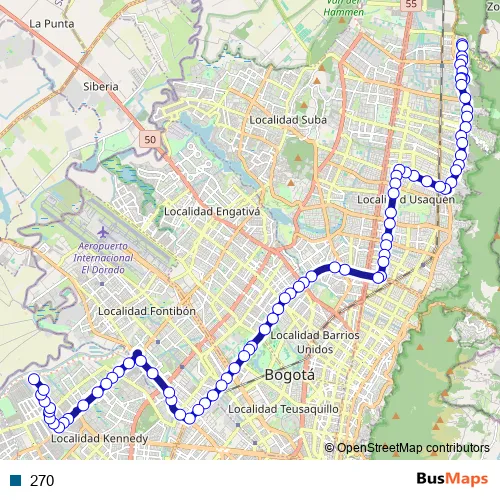 The first stop of the 270 bus route is KR 4 - CL 189a and the last stop is CL 26 Sur - KR 97f. 270 is operational during everyday.