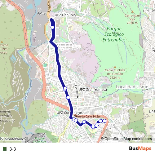 The first stop of the 3-3 bus route is Portal Usme - 3-2 Santa Librada and the last stop is Portal Usme - 3-2 Santa Librada. 3-3 is operational during everyday.