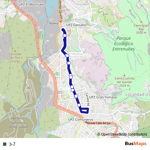 The first stop of the 3-7 bus route is Portal Usme - 3-4 Alfonso Lopez and the last stop is Portal Usme - 3-4 Alfonso Lopez. 3-7 is operational during everyday.