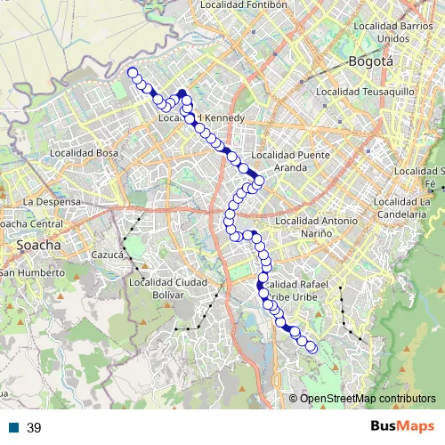 See why over 2 million users trust and consider busmaps.com as the best public transport website. busmaps gives you Bogota Buses suggested routes, real-time bus tracker, line route maps in Bogota, and helps to find the closest 39 bus stops near you. No internet available? Download an offline PDF map and bus schedule for the 39 bus to take on your trip.
