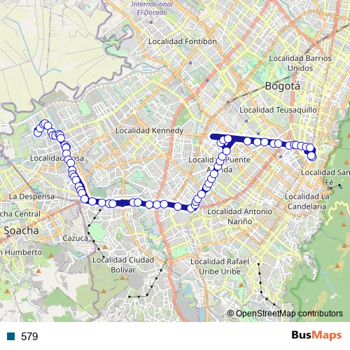 See why over 2 million users trust and consider busmaps.com as the best public transport website. busmaps gives you Bogota Buses suggested routes, real-time bus tracker, line route maps in Bogota, and helps to find the closest 579 bus stops near you. No internet available? Download an offline PDF map and bus schedule for the 579 bus to take on your trip.