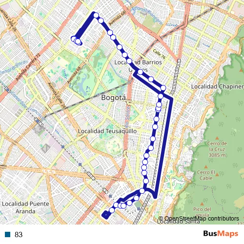 See why over 2 million users trust and consider busmaps.com as the best public transport website. busmaps gives you Bogota Buses suggested routes, real-time bus tracker, line route maps in Bogota, and helps to find the closest 83 bus stops near you. No internet available? Download an offline PDF map and bus schedule for the 83 bus to take on your trip.