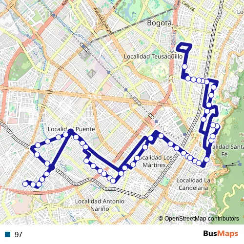 See why over 2 million users trust and consider busmaps.com as the best public transport website. busmaps gives you Bogota Buses suggested routes, real-time bus tracker, line route maps in Bogota, and helps to find the closest 97 bus stops near you. No internet available? Download an offline PDF map and bus schedule for the 97 bus to take on your trip.