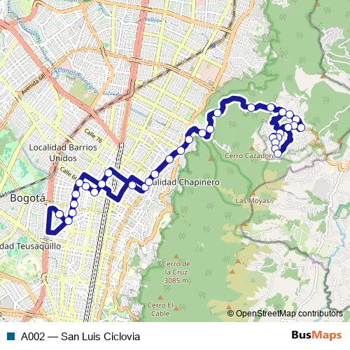 The first stop of the A002 bus route is DG 61C - CL 57C Br. El Campin and the last stop is DG 61C - CL 57C Br. El Campin. A002 (San Luis Ciclovia) is operational during everyday.