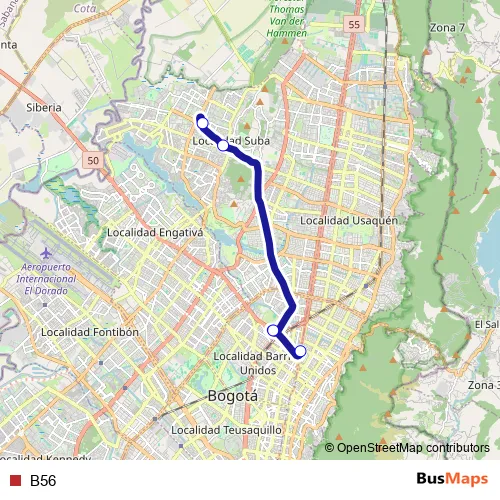 See why over 2 million users trust and consider busmaps.com as the best public transport website. busmaps gives you Bogota Buses suggested routes, real-time bus tracker, line route maps in Bogota, and helps to find the closest B56 bus stops near you. No internet available? Download an offline PDF map and bus schedule for the B56 bus to take on your trip.