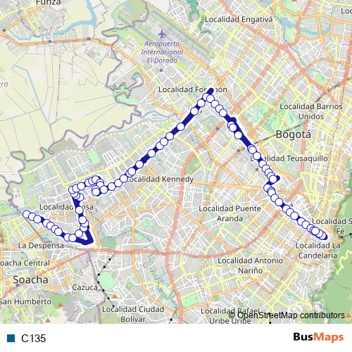 See why over 2 million users trust and consider busmaps.com as the best public transport website. busmaps gives you Bogota Buses suggested routes, real-time bus tracker, line route maps in Bogota, and helps to find the closest C135 bus stops near you. No internet available? Download an offline PDF map and bus schedule for the C135 bus to take on your trip.