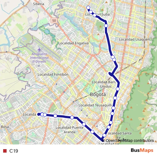 See why over 2 million users trust and consider busmaps.com as the best public transport website. busmaps gives you Bogota Buses suggested routes, real-time bus tracker, line route maps in Bogota, and helps to find the closest C19 bus stops near you. No internet available? Download an offline PDF map and bus schedule for the C19 bus to take on your trip.