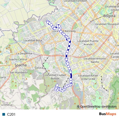 See why over 2 million users trust and consider busmaps.com as the best public transport website. busmaps gives you Bogota Buses suggested routes, real-time bus tracker, line route maps in Bogota, and helps to find the closest C201 bus stops near you. No internet available? Download an offline PDF map and bus schedule for the C201 bus to take on your trip.