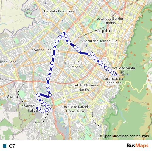 See why over 2 million users trust and consider busmaps.com as the best public transport website. busmaps gives you Bogota Buses suggested routes, real-time bus tracker, line route maps in Bogota, and helps to find the closest C7 bus stops near you. No internet available? Download an offline PDF map and bus schedule for the C7 bus to take on your trip.