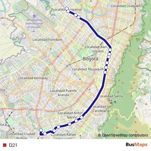 See why over 2 million users trust and consider busmaps.com as the best public transport website. busmaps gives you Bogota Buses suggested routes, real-time bus tracker, line route maps in Bogota, and helps to find the closest D21 bus stops near you. No internet available? Download an offline PDF map and bus schedule for the D21 bus to take on your trip.