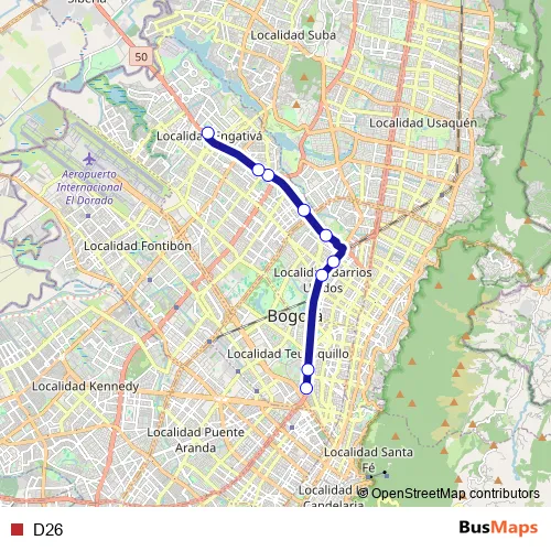 The first stop of the D26 bus route is Av. El Dorado A - 4 o 6 and the last stop is Portal 80 T2. D26 is operational during everyday.