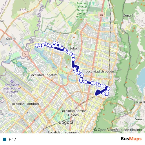 See why over 2 million users trust and consider busmaps.com as the best public transport website. busmaps gives you Bogota Buses suggested routes, real-time bus tracker, line route maps in Bogota, and helps to find the closest E17 bus stops near you. No internet available? Download an offline PDF map and bus schedule for the E17 bus to take on your trip.