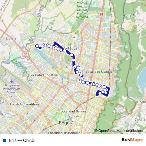 See why over 2 million users trust and consider busmaps.com as the best public transport website. busmaps gives you Bogota Buses suggested routes, real-time bus tracker, line route maps in Bogota, and helps to find the closest E17 bus stops near you. No internet available? Download an offline PDF map and bus schedule for the E17 bus to take on your trip.