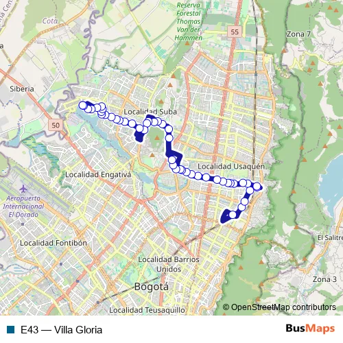 The first stop of the E43 bus route is CL 132 - KR 145a Br Villa Gloria Gaitana and the last stop is CL 132 - KR 145a Br Villa Gloria Gaitana. E43 (Villa Gloria) is operational during everyday.