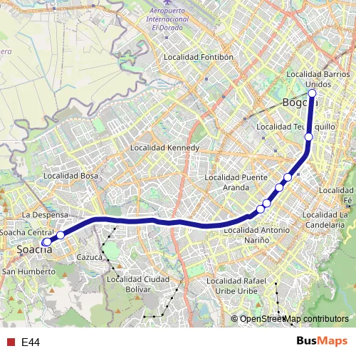 See why over 2 million users trust and consider busmaps.com as the best public transport website. busmaps gives you Bogota Buses suggested routes, real-time bus tracker, line route maps in Bogota, and helps to find the closest E44 bus stops near you. No internet available? Download an offline PDF map and bus schedule for the E44 bus to take on your trip.