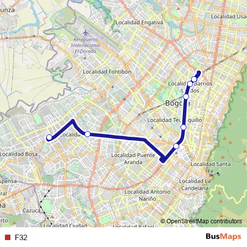See why over 2 million users trust and consider busmaps.com as the best public transport website. busmaps gives you Bogota Buses suggested routes, real-time bus tracker, line route maps in Bogota, and helps to find the closest F32 bus stops near you. No internet available? Download an offline PDF map and bus schedule for the F32 bus to take on your trip.