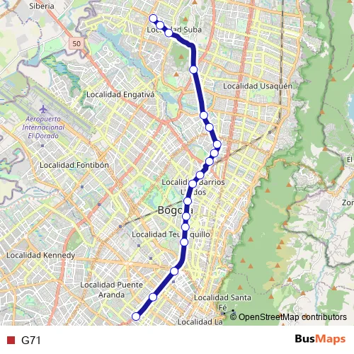 See why over 2 million users trust and consider busmaps.com as the best public transport website. busmaps gives you Bogota Buses suggested routes, real-time bus tracker, line route maps in Bogota, and helps to find the closest G71 bus stops near you. No internet available? Download an offline PDF map and bus schedule for the G71 bus to take on your trip.