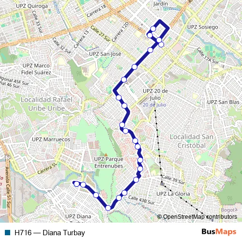 See why over 2 million users trust and consider busmaps.com as the best public transport website. busmaps gives you Bogota Buses suggested routes, real-time bus tracker, line route maps in Bogota, and helps to find the closest H716 bus stops near you. No internet available? Download an offline PDF map and bus schedule for the H716 bus to take on your trip.