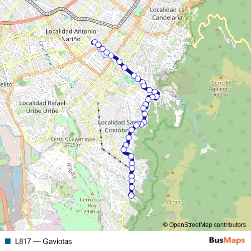 The first stop of the L817 bus route is KR 15 Este - CL 48 Sur Gaviotas and the last stop is KR 15 Este - CL 48 Sur Gaviotas. L817 (Gaviotas) is operational during everyday.