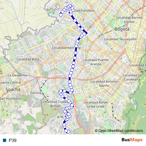 The first stop of the P39 bus route is KR 18G - CL 82B Sur and the last stop is DG 15A - KR 104. P39 is operational during everyday.