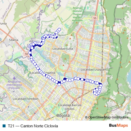 See why over 2 million users trust and consider busmaps.com as the best public transport website. busmaps gives you Bogota Buses suggested routes, real-time bus tracker, line route maps in Bogota, and helps to find the closest T21 bus stops near you. No internet available? Download an offline PDF map and bus schedule for the T21 bus to take on your trip.
