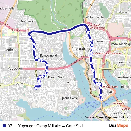The first stop of the 37 bus route is Terminus 37 Camp Militaire and the last stop is Gare Sud. 37 (Yopougon Camp Militaire ↔ Gare Sud) is operational during everyday.